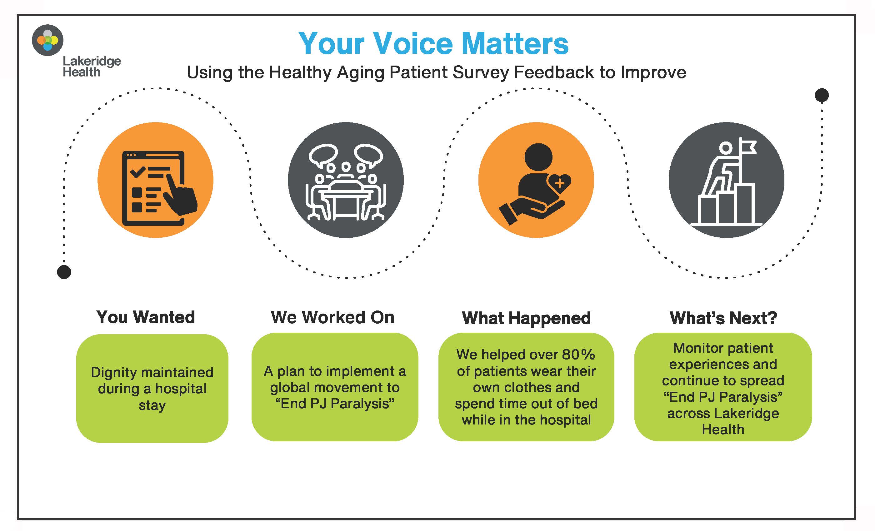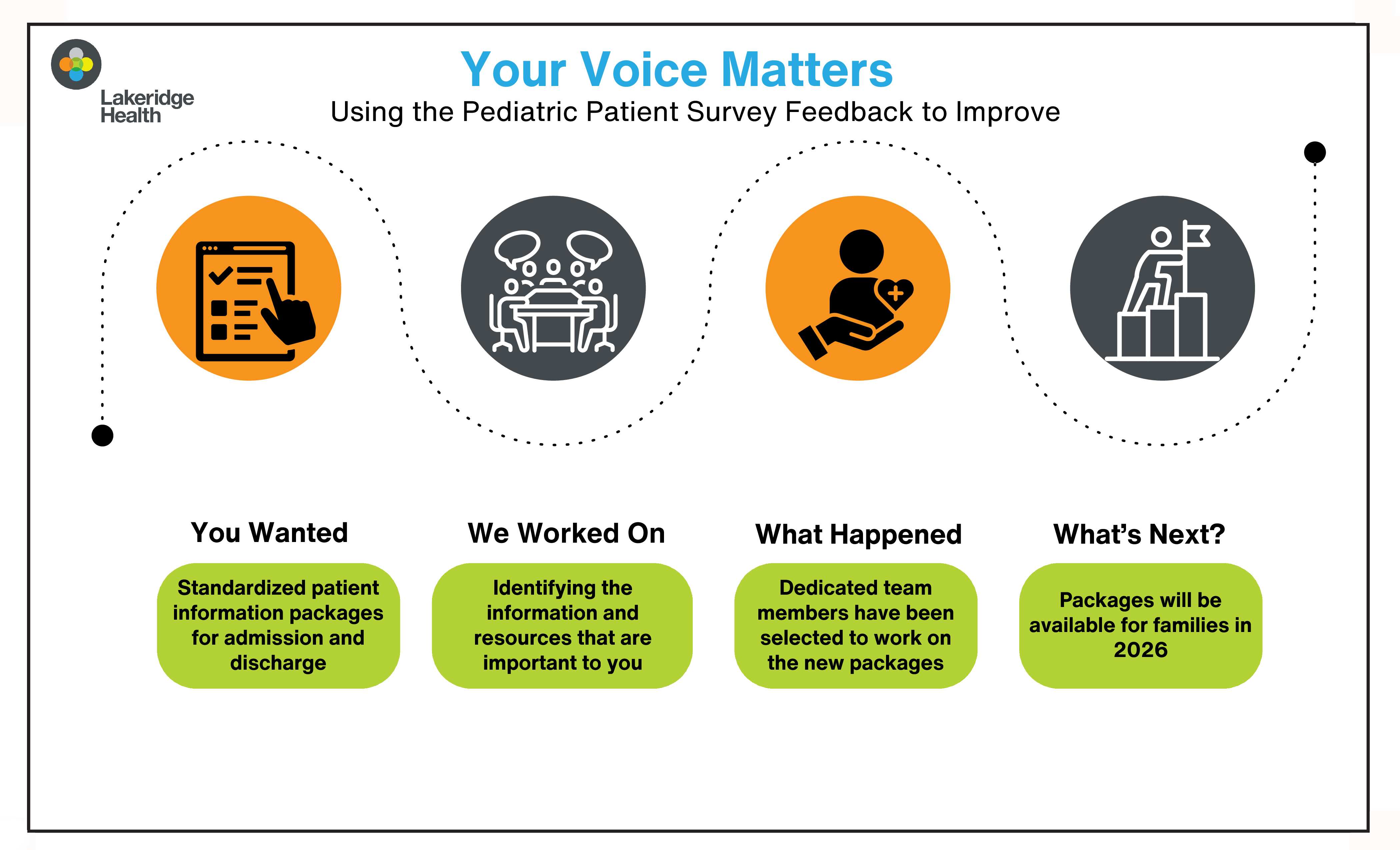 At Lakeridge Health, we value hearing from patients and families about their ideas and experience with the care that we provide, and the services offered. Patients and their families are encouraged to share their experience by taking a quick survey. It takes about 5 minutes to complete a survey.